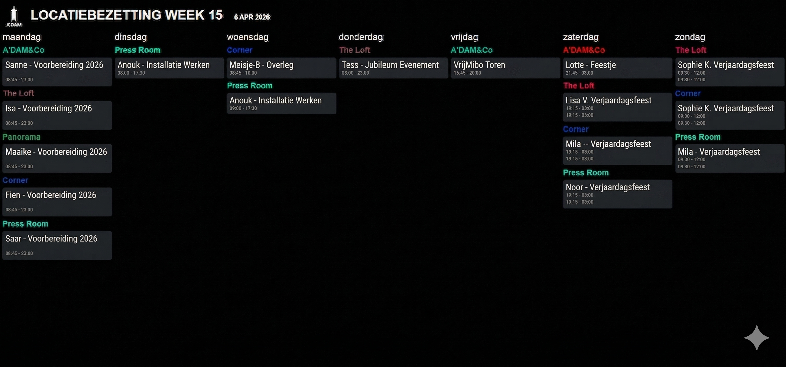 Bezetting per zaal voor de huidige en volgende week. Altijd actueel op locatie.